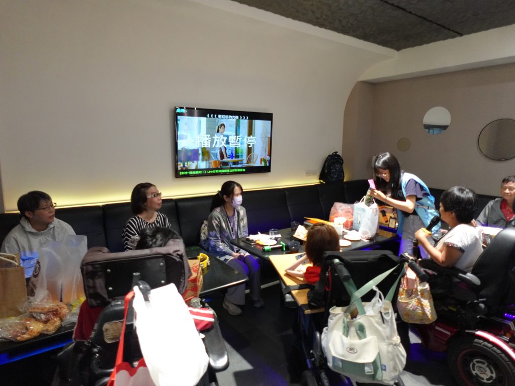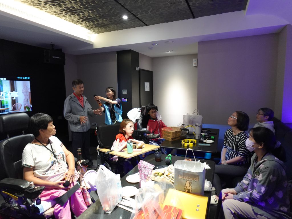 活動開始後,夥伴和陪同者們聚在一起,在台下輕鬆地唱著歌和介紹自己,並分享帶來的蛋糕和零食。大家都很放鬆,唱歌唱得很開心,現場笑聲不斷,氣氛溫馨又愉快,每個人帶來的點心雖然簡單,卻滿載心意,成為彼此交流的小橋樑。透過這樣輕鬆自在的唱歌和分享,大家感受到彼此的陪伴與支持。過程中,有位陪同者真誠地說,能和大家相聚真的很開心,覺得協會就像一個大家庭,彼此陪伴、互相支持,這種緣分非常珍貴,也讓人特別珍惜一起度過的時光。🎤🎵