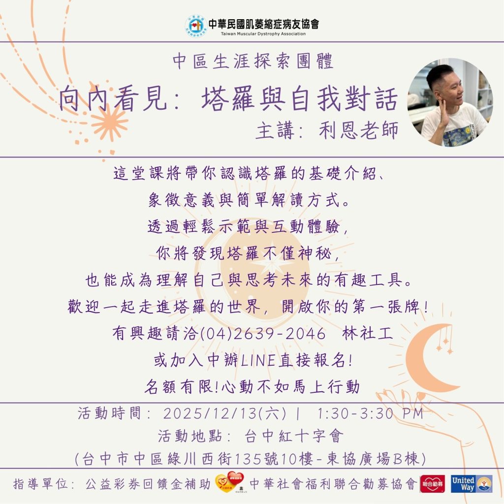 對塔羅牌好奇很久了嗎?總覺得它神秘、好像能說點什麼……卻不知道該從哪開始認識?此次協會特別邀請了利恩老師為大家進行塔羅入門探索課,帶你用最輕鬆的方式走進塔羅的世界!沒有任何基礎也沒關係,只要帶著好奇,你就能打開塔羅的第一扇門!如果你想了解自己、為未來找方向,或單純想接觸塔羅,這堂課都很適合你!名額有限,心動不如馬上行動!