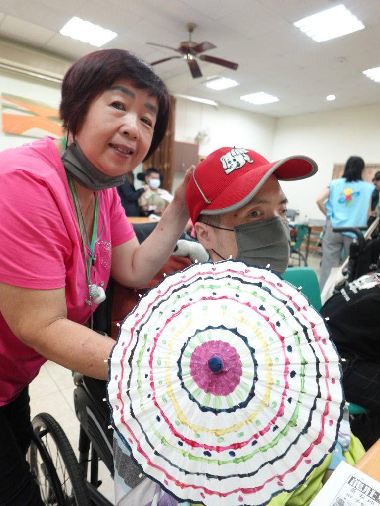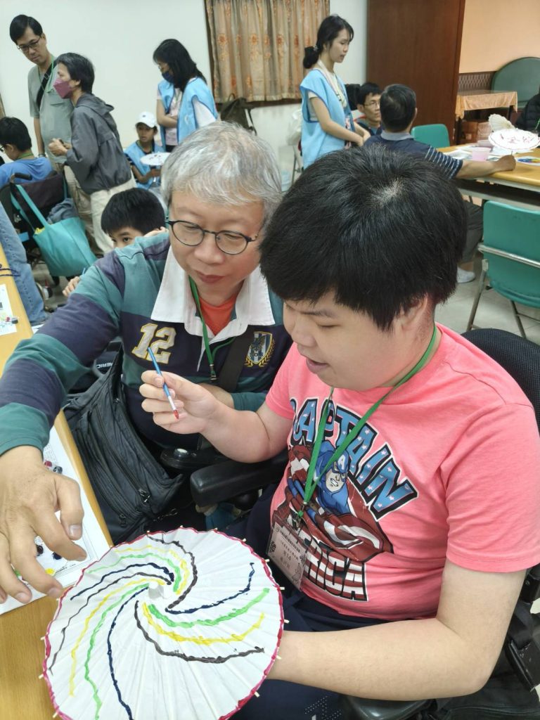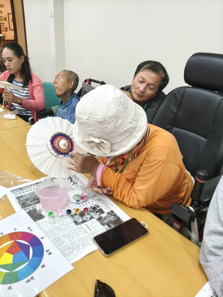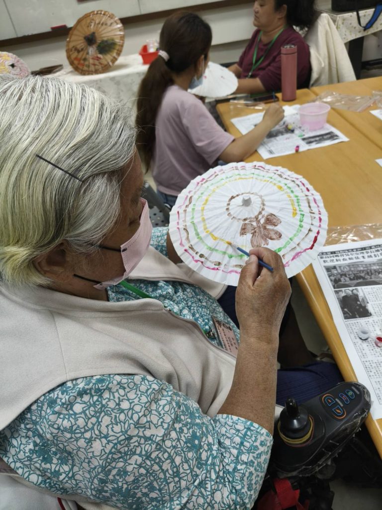 家庭們吃飽喝足來到教室,大家化身「細妹仔靚」與「緣投阿哥」,在傘面上揮灑創意、大展身手,最令大家著迷的是導覽員分享關於「圓滿線」的故事—紙傘張開的圓,象徵事事圓滿;傘中疊著五個人字,預祝人丁興旺。有的夥伴染出一片山水意境,有的夥伴將今日所見蝴蝶繪入傘中,有的夥伴專注的沿著傘緣勾勒出色彩斑斕的圓滿線條,每一筆都寄託了對生活的祝福,看著一把把獨一無二、富有手感溫度的油紙傘在手中誕生,每位夥伴臉上都寫滿了成就感。