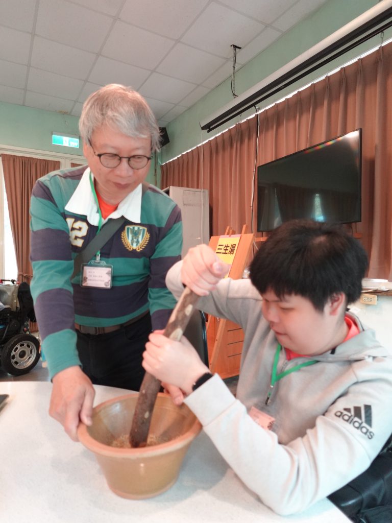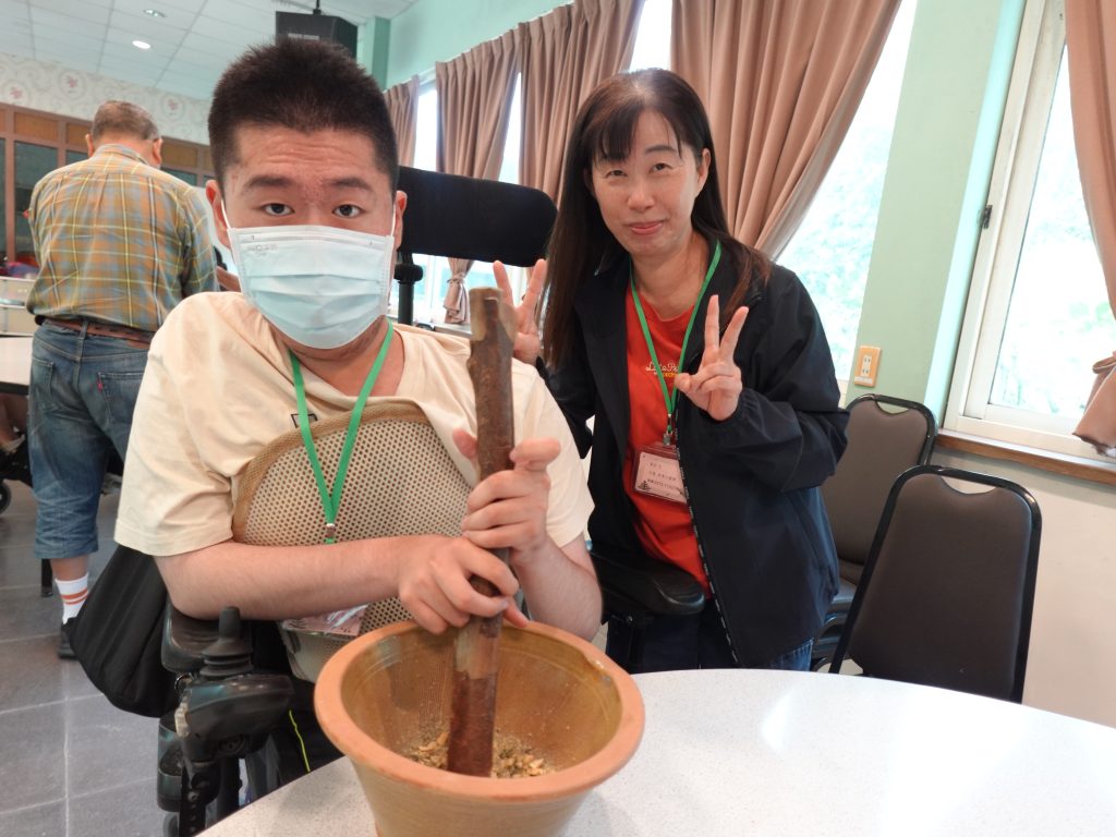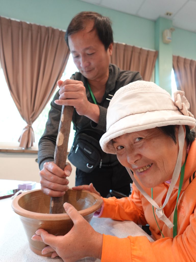 接著,家庭們體驗了用擂棒製作擂茶的過程,感受傳統飲品的獨特魅力。「用力喔!加油!」加油聲此起彼落,家庭們接力握起擂棒,將花生、芝麻研磨成粉,空氣中漸漸瀰漫起厚實的堅果香,這不只是一杯飲品,更是家庭成員間默契的考驗,當熱茶倒入,攪拌至食材完美交融的那一刻,一飲而下,所有的疲勞都煙消雲散,也有夥伴分享自己研磨的擂茶特別不一樣。午餐時分,道地的客家料理上桌,雖然略顯油膩,但卻讓家庭們深刻體會到客家飲食的「肥、鹹、香」三大特色,搭配由志工大姊準備的養樂多調和下,反倒顯得越嚼越香、回味無窮。